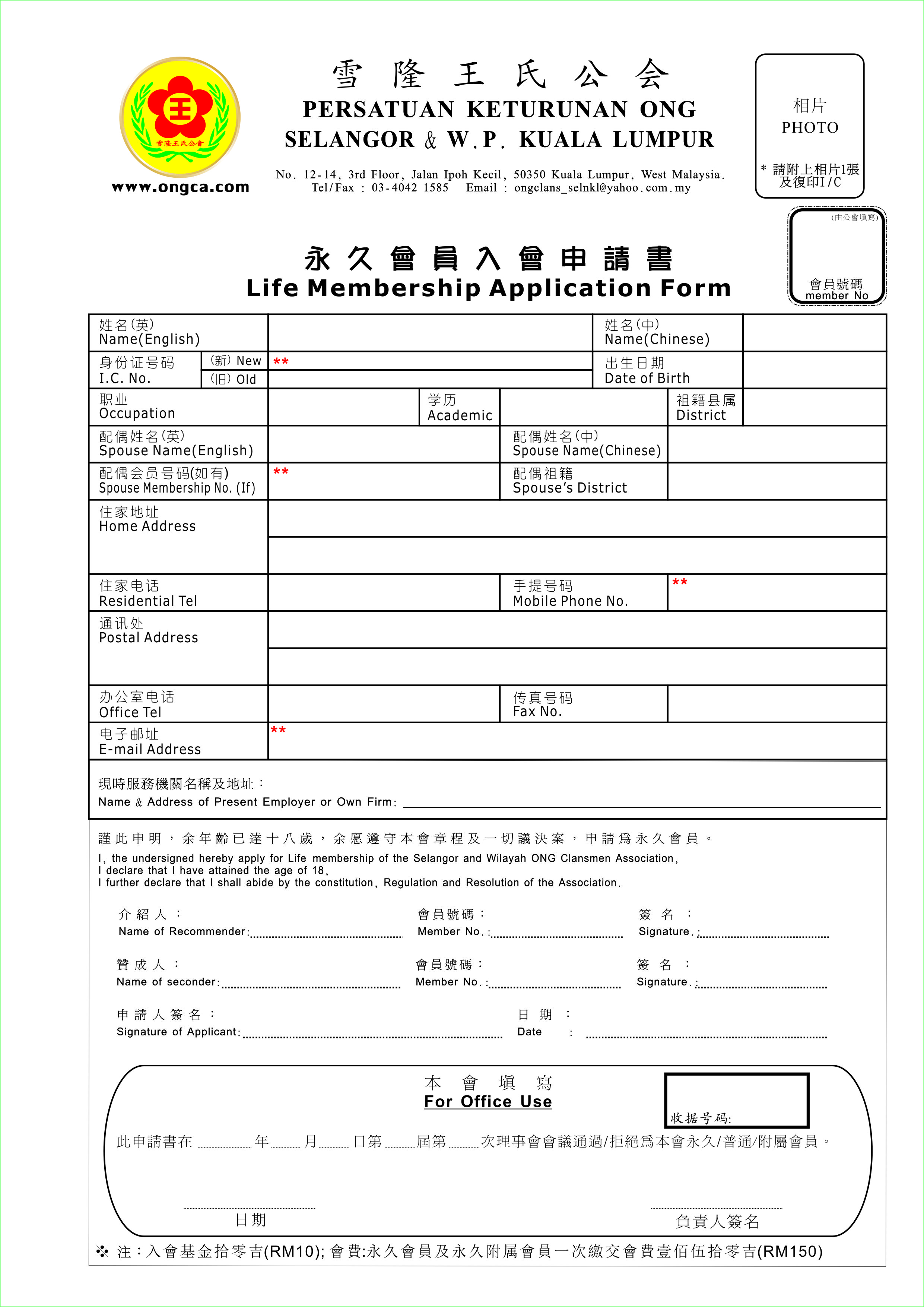 雪隆王氏公会入会表格(2015)